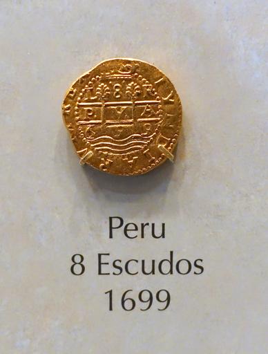 Keywords: 8 Escudos, Peru, 1699 - National Museum of American History - DSC00177.jpg en Exhibit in the National Museum of American History Washington DC USA Photography was permitted in the museum without restriction 2015-03-27 11 26 49 own Daderot other versions cc-zero Coins in the National Museum of American History Escudo Gold coins of Peru |