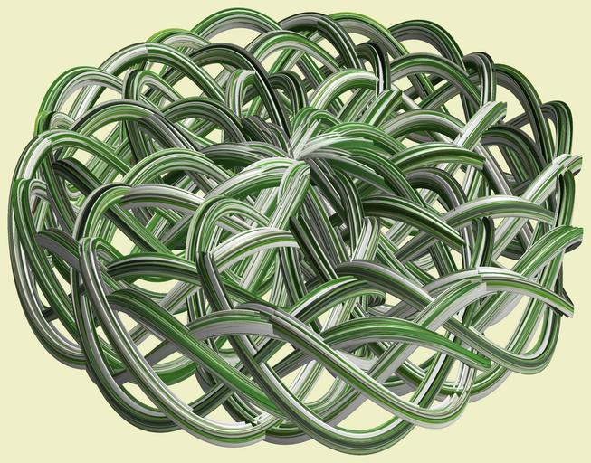 Keywords: mathematica 3d cg parametricplot3d texture torus code program algorithm プログラム コード アルゴリズム 輪環 りんかん ドーナツ どーなつ トーラス とーらす knot 結び目 むすびめ mapping テクスチャ マッピング 模様 もよう design pattern デザイン パターン graphic グラフィック グラフィクス structure 意匠 構造 symmetry 対称性 たいしょうせい シンメトリー 対称 たいしょう white background indoor a = 16; (* center hole size of a torus *) b1 = 9;(* the number of angles *) b2 = 4;(* the number of waves *) b3 = 4; (* the number of knots *) c = 12; (* distance from the center of rotation *) d = 8; (* the number of tori *) h1 = 1; (* width of a torus *) h2 = 1; (* width of a torus *) h3 = 8; (* height of cross *) SetOptions[ParametricPlot3D, PlotRange -> Full, Mesh -> None, Boxed -> False, Axes -> None, PlotPoints -> 500, ImageSize -> 3000, Background -> RGBColor[{240, 240, 200}/255], PlotStyle -> Directive[Specularity[White, 50], Texture[Import["D:/tmp/911.jpg"]]], TextureCoordinateFunction -> ({#4, #5 /Pi} &), Lighting -> "Neutral"]; x = (a - h1 Cos[t] + h2 Sin[b1 s]) Cos[b3 s] + c; y = (a - h1 Cos[t] + h2 Sin[b1 s]) Sin[b3 s] + c; z = h3 Cos[b1 s] + Sin[b2 t] + c; rm = Table[{x, y, z}.RotationMatrix[2 i Pi/d, {0, 0, 1}], {i, d}]; ParametricPlot3D[rm, {t, 0, 2 Pi}, {s, 0, 2 Pi}] (*--- The Texture *) a = 16; (* center hole size of a torus *) b1 = 9;(* the number of angles *) b2 = 4;(* the number of waves *) b3 = 4; (* the number of knots *) c = 12; (* distance from the center of rotation *) d = 8; (* the number of tori *) h1 = 1; (* width of a torus *) h2 = 1; (* width of a torus *) h3 = 8; (* height of cross *) SetOptions[ParametricPlot3D, PlotRange -> Full, Mesh -> None, Boxed -> False, Axes -> None, PlotPoints -> 500, ImageSize -> 3000, Background -> RGBColor[{240, 240, 200}/255], PlotStyle -> Directive[Specularity[White, 50], Texture[Import["D:/tmp/911.jpg"]]], TextureCoordinateFunction -> ({#4, #5 /Pi} &), Lighting -> "Neutral"]; x = (a - h1 Cos[t] + h2 Sin[b1 s]) Cos[b3 s] + c; y = (a - h1 Cos[t] + h2 Sin[b1 s]) Sin[b3 s] + c; z = h3 Cos[b1 s] + Sin[b2 t] + c; rm = Table[{x, y, z}.RotationMatrix[2 i Pi/d, {0, 0, 1}], {i, d}]; ParametricPlot3D[rm, {t, 0, 2 Pi}, {s, 0, 2 Pi}] (*--- The Texture *) |