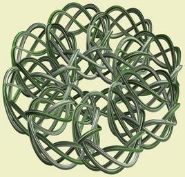 Keywords: mathematica 3d cg parametricplot3d texture torus code program algorithm プログラム コード アルゴリズム 輪環 りんかん ドーナツ どーなつ トーラス とーらす knot 結び目 むすびめ mapping テクスチャ マッピング 模様 もよう design pattern デザイン パターン graphic グラフィック グラフィクス structure 意匠 構造 symmetry 対称性 たいしょうせい シンメトリー 対称 たいしょう tangle indoor white background drawing a = 16; (* center hole size of a torus *) b1 = 9;(* the number of angles *) b2 = 4;(* the number of waves *) b3 = 4; (* the number of knots *) c = 20; (* distance from the center of rotation *) d = 8; (* the number of tori *) h1 = 1; (* width of a torus *) h2 = 1; (* width of a torus *) h3 = 12; (* height of cross *) SetOptions[ParametricPlot3D, PlotRange -> Full, Mesh -> None, Boxed -> False, Axes -> None, PlotPoints -> 500, ImageSize -> 3000, Background -> RGBColor[{240, 240, 200}/255], PlotStyle -> Directive[Specularity[White, 50], Texture[Import["D:/tmp/911.jpg"]]], TextureCoordinateFunction -> ({#4, #5 /Pi} &), Lighting -> "Neutral"]; x = (a - h1 Cos[t] + h2 Sin[b1 s]) Cos[b3 s] + c; y = (a - h1 Cos[t] + h2 Sin[b1 s]) Sin[b3 s] + c; z = h3 Cos[b1 s] + Sin[b2 t] + c; rm = Table[{x, y, z}.RotationMatrix[2 i Pi/d, {0, 0, 1}], {i, d}]; ParametricPlot3D[rm, {t, 0, 2 Pi}, {s, 0, 2 Pi}] (*--- The Texture *) a = 16; (* center hole size of a torus *) b1 = 9;(* the number of angles *) b2 = 4;(* the number of waves *) b3 = 4; (* the number of knots *) c = 20; (* distance from the center of rotation *) d = 8; (* the number of tori *) h1 = 1; (* width of a torus *) h2 = 1; (* width of a torus *) h3 = 12; (* height of cross *) SetOptions[ParametricPlot3D, PlotRange -> Full, Mesh -> None, Boxed -> False, Axes -> None, PlotPoints -> 500, ImageSize -> 3000, Background -> RGBColor[{240, 240, 200}/255], PlotStyle -> Directive[Specularity[White, 50], Texture[Import["D:/tmp/911.jpg"]]], TextureCoordinateFunction -> ({#4, #5 /Pi} &), Lighting -> "Neutral"]; x = (a - h1 Cos[t] + h2 Sin[b1 s]) Cos[b3 s] + c; y = (a - h1 Cos[t] + h2 Sin[b1 s]) Sin[b3 s] + c; z = h3 Cos[b1 s] + Sin[b2 t] + c; rm = Table[{x, y, z}.RotationMatrix[2 i Pi/d, {0, 0, 1}], {i, d}]; ParametricPlot3D[rm, {t, 0, 2 Pi}, {s, 0, 2 Pi}] (*--- The Texture *) |