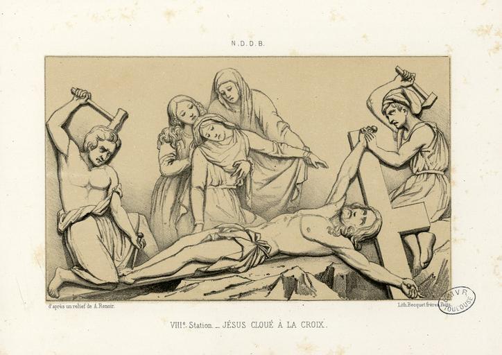 Keywords: 8e Station - Jésus cloué à la Croix - Fonds Ancely - B315556101 A GORSE 12 045.jpg Fait partie d'un album de planches dessinées et lithographiées sur fond bistre par Pierre Gorse imprimées chez Becquet frères à Paris annoncées par 1 page de titre lithographiée Pl 9 à 13 dessinées par Gorse d'après un relief d'Auguste Renoir Se vend au profit de la restauration de la Chapelle à Bétharram Ancely René 1876 - 1966 Possesseur fre public domain domaine public B315556101_A_GORSE_12_045 jpg image/jpeg 1 f de pl lith en camaïeu ; 14 5 cm oblong Renoir Alexandre Illustrateur Becquet 18 - 18 ; imprimeur Lithographe Vignancour E Editeur http //numerique bibliotheque toulouse fr/collect/general/index/assoc//ark /74899/B315556101_A_GORSE_12_045 dir/B315556101_A_GORSE_12_045 jpg Bibliothèque municipale de Toulouse A-GORSE 12-17 Creator Pierre Gorse http //catalogues toulouse fr/web2/tramp2 exe/do_keyword_search/log_in setting_key BMT1 servers 1home query p000825 vignette http //numerique bibliotheque toulouse fr/collect/general/index/assoc//ark /74899/B315556101_A_GORSE_12_045 dir/B315556101_A_GORSE_12_045_thumb jpeg century 19 8e Station - Jésus cloué à la Croix B315556101_A_GORSE_12_045 lithography - print Lestelle-Bétharram Pierre Gorse Historical images of Pyrénées-Atlantiques Kneeling men in art Notre-Dame Bétharram Station 11 Crucifixion Jesus is nailed to the cross |