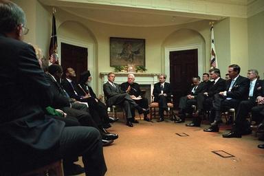 Keywords: washington d.c. dc u.s. national archives usnationalarchives 9/11 911 president george w. bush presidentgeorgewbush nara:arcid=5997335 religious leaders religiousleaders george w. bush georgewbush george w. bush presidential library georgewbushpresidentiallibrary indoor Original Caption: President George W. Bush meets with religious leaders in the Roosevelt Room of the White House. U.S. National Archives’ Local Identifier:P7602-19 Created By: President (2001-2009 : Bush). Office of Management and Administration. Office of White House Management. Photography Office. (01/20/2001 - 01/20/2009) From: Photographs Related to the George W. Bush Administration, compiled 01/20/2001 - 01/20/2009 Production Dates: 09/20/2001 Persistent URL: arcweb.archives.gov/arc/action/ExternalIdSearch?id=5997335 Repository: George W. Bush Library (Lewisville, TX) Access Restrictions: Unrestricted Use Restrictions: Unrestricted Original Caption: President George W. Bush meets with religious leaders in the Roosevelt Room of the White House. U.S. National Archives’ Local Identifier:P7602-19 Created By: President (2001-2009 : Bush). Office of Management and Administration. Office of White House Management. Photography Office. (01/20/2001 - 01/20/2009) From: Photographs Related to the George W. Bush Administration, compiled 01/20/2001 - 01/20/2009 Production Dates: 09/20/2001 Persistent URL: arcweb.archives.gov/arc/action/ExternalIdSearch?id=5997335 Repository: George W. Bush Library (Lewisville, TX) Access Restrictions: Unrestricted Use Restrictions: Unrestricted |