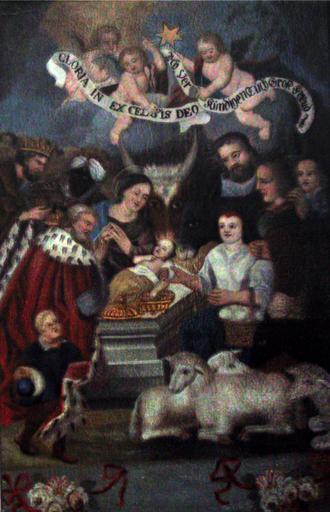Keywords: 92 WP Gimborn Kirche Gemälde.JPG painting 'Adoration of the Kings' parish church of Gimborn district of Marienheide North Rhine-Westphalia Germany Oil on canvas; 250 x 160 cm; 18th c Probably family of benefactor as shepherds photography 2008-03-07 unknown; photographed by me --Chrihalb 17 45 8 March 2008 UTC Sankt Johann Baptist Gimborn 18th-century paintings in Germany |