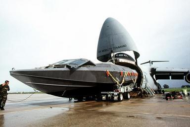 | Keywords: df-sd-01-08667 dfsd0108667 unknown california (ca) californiaca united states of america (usa) unitedstatesofamericausa vehicle aircraft airplane outdoor A Navy Mark V special operations craft, a 50-ton, 82-foot-long speed boat used to insert and extract SEAL combat swimmers in and out of high-threat areas, is squeezed into a C-5 Galaxy aircraft from the 349th Air Mobility Wing, Travis Air Force Base, California, with only inches to spare. Not only do the loadmasters manage to wedge the boat aboard as well as the 18-wheel tractor trailor it sits on, but they also fit in a "deuce-and-a-half" truck (not shown), and a High-Mobility Multipurpose Wheeled Vehicle (HMMWV)and trailer (not shown). The Mark V and its trailer were constructed with the C-5 and rapid global mobility in mind. This photograph was used in the October 1999 issue of Airman Magazine. A Navy Mark V special operations craft, a 50-ton, 82-foot-long speed boat used to insert and extract SEAL combat swimmers in and out of high-threat areas, is squeezed into a C-5 Galaxy aircraft from the 349th Air Mobility Wing, Travis Air Force Base, California, with only inches to spare. Not only do the loadmasters manage to wedge the boat aboard as well as the 18-wheel tractor trailor it sits on, but they also fit in a "deuce-and-a-half" truck (not shown), and a High-Mobility Multipurpose Wheeled Vehicle (HMMWV)and trailer (not shown). The Mark V and its trailer were constructed with the C-5 and rapid global mobility in mind. This photograph was used in the October 1999 issue of Airman Magazine. |