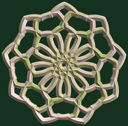 Keywords: mathematica 3d cg parametricplot3d texture torus code program algorithm プログラム コード アルゴリズム 輪環 りんかん ドーナツ どーなつ 六芒星 ろくぼうせい geometric sculpture geometricsculpture shape geometry sculpture mapping テクスチャ マッピング 模様 もよう abstract 抽象 ちゅうしょう アブストラクト design pattern デザイン パターン graphic グラフィック グラフィクス structure 意匠 構造 symmetry 対称性 たいしょうせい シンメトリー 対称 たいしょう organic pattern tangle black background a = 9; (* center hole size *) b = 6; (* hexa-torus *) c = 6; (* distance from the center of rotation *) d = 9; (* number of torus *) h = 0; (* height of a torus *) SetOptions[ParametricPlot3D, PlotRange -> Full, Mesh -> None, Boxed -> False, Axes -> False, PlotPoints -> 400, ImageSize -> 3000, Background -> RGBColor[{20, 50, 30}/255], PlotStyle -> Directive[Specularity[White, 40], Texture[Import["D:/tmp/862.jpg"]]], TextureCoordinateFunction -> ({#4 + #5, #5 / Pi} &), Lighting -> "Neutral"]; f[v_] := TriangleWave[{-1, 1}, v/(2 Pi)]; g[v_] := TriangleWave[{-1, 1}, v/(2 Pi) + 1/4]; x = (a - g[t] - f[b s]) Cos[s] + c; y = (a - g[t] - f[b s]) Sin[s] + c; z = (a - f[t] - h f[b s]); rm = Table[{x, y, z}.RotationMatrix[2 i Pi/d, {0, 0, 1}], {i, d}]; ParametricPlot3D[rm, {t, 0, 2 Pi}, {s, 0, Pi}] (*--- The Texture *) a = 9; (* center hole size *) b = 6; (* hexa-torus *) c = 6; (* distance from the center of rotation *) d = 9; (* number of torus *) h = 0; (* height of a torus *) SetOptions[ParametricPlot3D, PlotRange -> Full, Mesh -> None, Boxed -> False, Axes -> False, PlotPoints -> 400, ImageSize -> 3000, Background -> RGBColor[{20, 50, 30}/255], PlotStyle -> Directive[Specularity[White, 40], Texture[Import["D:/tmp/862.jpg"]]], TextureCoordinateFunction -> ({#4 + #5, #5 / Pi} &), Lighting -> "Neutral"]; f[v_] := TriangleWave[{-1, 1}, v/(2 Pi)]; g[v_] := TriangleWave[{-1, 1}, v/(2 Pi) + 1/4]; x = (a - g[t] - f[b s]) Cos[s] + c; y = (a - g[t] - f[b s]) Sin[s] + c; z = (a - f[t] - h f[b s]); rm = Table[{x, y, z}.RotationMatrix[2 i Pi/d, {0, 0, 1}], {i, d}]; ParametricPlot3D[rm, {t, 0, 2 Pi}, {s, 0, Pi}] (*--- The Texture *) |