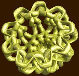 Keywords: mathematica 3d cg parametricplot3d texture torus 輪環 りんかん ドーナツ どーなつ 六芒星 ろくぼうせい 六光星 ろくこうせい 六稜星 ろくりょうせい code program algorithm コード プログラム アルゴリズム hexagram geometric sculpture geometricsculpture shape geometry sculpture mapping テクスチャ マッピング 模様 もよう abstract 抽象 ちゅうしょう アブストラクト design pattern デザイン パターン graphic グラフィック グラフィクス structure 意匠 構造 symmetry 対称性 たいしょうせい シンメトリー 対称 たいしょう algorithm コード indoor black background organic pattern tangle food bright a = 9; (* center hole size of a torus *) b = 6; (* hexa-torus *) c = 3; (* distance from the center of rotation *) d = 9; (* number of torus *) h = 2; (* height of a torus *) SetOptions[ParametricPlot3D, PlotRange -> Full, Mesh -> None, Boxed -> False, Axes -> False, PlotPoints -> 400, ImageSize -> 3000, Background -> Darker[Orange, 0.8], PlotStyle -> Directive[Specularity[White, 30], Texture[Import["D:/tmp/71.jpg"]]], TextureCoordinateFunction -> ({#4 , #5 2 Pi} &), Lighting -> "Neutral"]; f[v_] := Sin[2 Sin[Sin[Sin[v]]]]; x = (a - Cos[t] - f[b s]) Cos[s] + c; y = (a - Cos[t] - f[b s]) Sin[s] + c; z = (a - Sin[t] - h f[b s]); rot = Table[{x, y, z}.RotationMatrix[2 i Pi/d, {1, 1, 1}], {i, d}]; ParametricPlot3D[rot, {t, 0, 2 Pi}, {s, 0, 2 Pi}] (*--- The Texture is this: www.flickr.com/photos/tanaka_juuyoh/5239255695/ *) a = 9; (* center hole size of a torus *) b = 6; (* hexa-torus *) c = 3; (* distance from the center of rotation *) d = 9; (* number of torus *) h = 2; (* height of a torus *) SetOptions[ParametricPlot3D, PlotRange -> Full, Mesh -> None, Boxed -> False, Axes -> False, PlotPoints -> 400, ImageSize -> 3000, Background -> Darker[Orange, 0.8], PlotStyle -> Directive[Specularity[White, 30], Texture[Import["D:/tmp/71.jpg"]]], TextureCoordinateFunction -> ({#4 , #5 2 Pi} &), Lighting -> "Neutral"]; f[v_] := Sin[2 Sin[Sin[Sin[v]]]]; x = (a - Cos[t] - f[b s]) Cos[s] + c; y = (a - Cos[t] - f[b s]) Sin[s] + c; z = (a - Sin[t] - h f[b s]); rot = Table[{x, y, z}.RotationMatrix[2 i Pi/d, {1, 1, 1}], {i, d}]; ParametricPlot3D[rot, {t, 0, 2 Pi}, {s, 0, 2 Pi}] (*--- The Texture is this: www.flickr.com/photos/tanaka_juuyoh/5239255695/ *) |