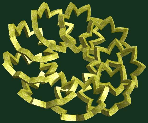 Keywords: mathematica 3d cg parametricplot3d texture torus code program algorithm プログラム コード アルゴリズム 輪環 りんかん ドーナツ どーなつ 八芒星 はちぼうせい geometric sculpture geometricsculpture shape geometry sculpture mapping テクスチャ マッピング 模様 もよう abstract 抽象 ちゅうしょう アブストラクト design pattern デザイン パターン graphic グラフィック グラフィクス structure 意匠 構造 symmetry 対称性 たいしょうせい シンメトリー 対称 たいしょう organic pattern black background a = 6; (* center hole size *) b = 8; (* octa-torus *) c = 10; (* distance from the center of rotation *) d = 9; (* number of torus *) h = 1; (* height of a torus *) SetOptions[ParametricPlot3D, PlotRange -> Full, Mesh -> None, Boxed -> False, Axes -> False, PlotPoints -> 400, ImageSize -> 3000, Background -> RGBColor[{20, 50, 30}/255], PlotStyle -> Directive[Specularity[White, 30], Texture[Import["D:/tmp/71.jpg"]]], TextureCoordinateFunction -> ({#4, #5 Pi} &), Lighting -> "Neutral"]; f[v_] := TriangleWave[{-1, 1}, v/(2 Pi)]; g[v_] := TriangleWave[{-1, 1}, v/(2 Pi) + 1/4]; x = (a - g[t] - f[b s]) Cos[s] + c; y = (a - g[t] - f[b s]) Sin[s] + c; z = (a - f[t] - h f[b s]); rm = Table[{x, y, z}.RotationMatrix[2 i Pi/d, {0, 1, 2}], {i, d}]; ParametricPlot3D[rm, {t, 0, 2 Pi}, {s, 0, Pi}] (*--- The Texture *) a = 6; (* center hole size *) b = 8; (* octa-torus *) c = 10; (* distance from the center of rotation *) d = 9; (* number of torus *) h = 1; (* height of a torus *) SetOptions[ParametricPlot3D, PlotRange -> Full, Mesh -> None, Boxed -> False, Axes -> False, PlotPoints -> 400, ImageSize -> 3000, Background -> RGBColor[{20, 50, 30}/255], PlotStyle -> Directive[Specularity[White, 30], Texture[Import["D:/tmp/71.jpg"]]], TextureCoordinateFunction -> ({#4, #5 Pi} &), Lighting -> "Neutral"]; f[v_] := TriangleWave[{-1, 1}, v/(2 Pi)]; g[v_] := TriangleWave[{-1, 1}, v/(2 Pi) + 1/4]; x = (a - g[t] - f[b s]) Cos[s] + c; y = (a - g[t] - f[b s]) Sin[s] + c; z = (a - f[t] - h f[b s]); rm = Table[{x, y, z}.RotationMatrix[2 i Pi/d, {0, 1, 2}], {i, d}]; ParametricPlot3D[rm, {t, 0, 2 Pi}, {s, 0, Pi}] (*--- The Texture *) |