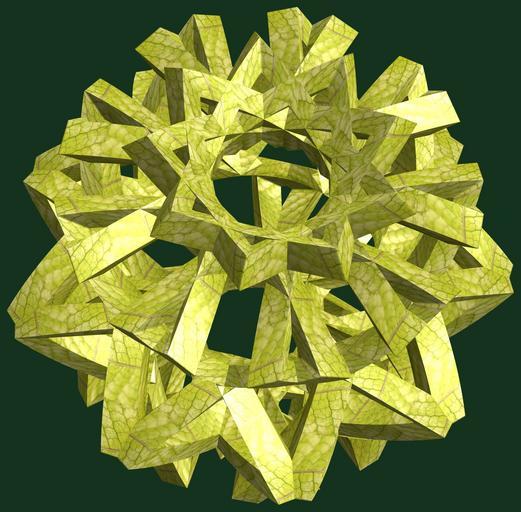 Keywords: mathematica 3d cg parametricplot3d texture torus code program algorithm プログラム コード アルゴリズム 輪環 りんかん ドーナツ どーなつ 八芒星 はちぼうせい geometric sculpture geometricsculpture shape geometry sculpture mapping テクスチャ マッピング 模様 もよう abstract 抽象 ちゅうしょう アブストラクト design pattern デザイン パターン graphic グラフィック グラフィクス structure 意匠 構造 symmetry 対称性 たいしょうせい シンメトリー 対称 たいしょう organic pattern foliage plant leaf outdoor tree black background a = 8; (* center hole size *) b = 8; (* octa-torus *) c = -5; (* distance from the center of rotation *) d = 9; (* number of torus *) h = 2; (* height of a torus *) SetOptions[ParametricPlot3D, PlotRange -> Full, Mesh -> None, Boxed -> False, Axes -> False, PlotPoints -> 400, ImageSize -> 3000, Background -> RGBColor[{20, 50, 30}/255], PlotStyle -> Directive[Specularity[White, 30], Texture[Import["D:/tmp/71.jpg"]]], TextureCoordinateFunction -> ({#4, #5 Pi} &), Lighting -> "Neutral"]; f[v_] := TriangleWave[{-1, 1}, v/(2 Pi)]; g[v_] := TriangleWave[{-1, 1}, v/(2 Pi) + 1/4]; x = (a - g[t] - f[b s]) Cos[s + Pi/(2 b)]; y = (a - g[t] - f[b s]) Sin[s + Pi/(2 b)]; z = (a - f[t] - h f[b s]) + c; rm = Table[{x, y, z}.RotationMatrix[2 i Pi/d, {1, 1, 0}], {i, d}]; ParametricPlot3D[rm, {t, 0, 2 Pi}, {s, 0, Pi}] (*--- The Texture *) a = 8; (* center hole size *) b = 8; (* octa-torus *) c = -5; (* distance from the center of rotation *) d = 9; (* number of torus *) h = 2; (* height of a torus *) SetOptions[ParametricPlot3D, PlotRange -> Full, Mesh -> None, Boxed -> False, Axes -> False, PlotPoints -> 400, ImageSize -> 3000, Background -> RGBColor[{20, 50, 30}/255], PlotStyle -> Directive[Specularity[White, 30], Texture[Import["D:/tmp/71.jpg"]]], TextureCoordinateFunction -> ({#4, #5 Pi} &), Lighting -> "Neutral"]; f[v_] := TriangleWave[{-1, 1}, v/(2 Pi)]; g[v_] := TriangleWave[{-1, 1}, v/(2 Pi) + 1/4]; x = (a - g[t] - f[b s]) Cos[s + Pi/(2 b)]; y = (a - g[t] - f[b s]) Sin[s + Pi/(2 b)]; z = (a - f[t] - h f[b s]) + c; rm = Table[{x, y, z}.RotationMatrix[2 i Pi/d, {1, 1, 0}], {i, d}]; ParametricPlot3D[rm, {t, 0, 2 Pi}, {s, 0, Pi}] (*--- The Texture *) |
