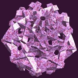 Keywords: mathematica 3d cg parametricplot3d texture torus code program algorithm プログラム コード アルゴリズム 輪環 りんかん ドーナツ どーなつ 八芒星 はちぼうせい geometric sculpture geometricsculpture shape geometry sculpture mapping テクスチャ マッピング 模様 もよう abstract 抽象 ちゅうしょう アブストラクト design pattern デザイン パターン graphic グラフィック グラフィクス structure 意匠 構造 symmetry 対称性 たいしょうせい シンメトリー 対称 たいしょう black background plant blossom flower cluster flower a = 8; (* center hole size *) b = 8; (* octa-torus *) c = -8; (* distance from the center of rotation *) d = 9; (* number of torus *) h = 2; (* height of a torus *) SetOptions[ParametricPlot3D, PlotRange -> Full, Mesh -> None, Boxed -> False, Axes -> False, PlotPoints -> 400, ImageSize -> 3000, Background -> RGBColor[{50, 20, 50}/255], PlotStyle -> Directive[Specularity[White, 30], Texture[Import["D:/tmp/92.jpg"]]], TextureCoordinateFunction -> ({#4, #5 Pi} &), Lighting -> "Neutral"]; f[v_] := TriangleWave[{-1, 1}, v/(2 Pi)]; g[v_] := TriangleWave[{-1, 1}, v/(2 Pi) + 1/4]; x = (a - g[t] - f[b s]) Cos[s + Pi/(2 b)]; y = (a - g[t] - f[b s]) Sin[s + Pi/(2 b)]; z = (a - f[t] - h f[b s]) + c; rm = Table[{x, y, z}.RotationMatrix[2 i Pi/d, {1, 1, 0}], {i, d}]; ParametricPlot3D[rm, {t, 0, 2 Pi}, {s, 0, Pi}] (*--- The Texture *) a = 8; (* center hole size *) b = 8; (* octa-torus *) c = -8; (* distance from the center of rotation *) d = 9; (* number of torus *) h = 2; (* height of a torus *) SetOptions[ParametricPlot3D, PlotRange -> Full, Mesh -> None, Boxed -> False, Axes -> False, PlotPoints -> 400, ImageSize -> 3000, Background -> RGBColor[{50, 20, 50}/255], PlotStyle -> Directive[Specularity[White, 30], Texture[Import["D:/tmp/92.jpg"]]], TextureCoordinateFunction -> ({#4, #5 Pi} &), Lighting -> "Neutral"]; f[v_] := TriangleWave[{-1, 1}, v/(2 Pi)]; g[v_] := TriangleWave[{-1, 1}, v/(2 Pi) + 1/4]; x = (a - g[t] - f[b s]) Cos[s + Pi/(2 b)]; y = (a - g[t] - f[b s]) Sin[s + Pi/(2 b)]; z = (a - f[t] - h f[b s]) + c; rm = Table[{x, y, z}.RotationMatrix[2 i Pi/d, {1, 1, 0}], {i, d}]; ParametricPlot3D[rm, {t, 0, 2 Pi}, {s, 0, Pi}] (*--- The Texture *) |
