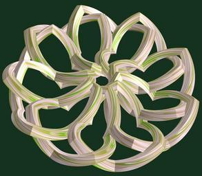 Keywords: mathematica 3d cg parametricplot3d texture torus code program algorithm tri-torus tritorus プログラム コード アルゴリズム 輪環 りんかん ドーナツ どーなつ 三芒星 さんぼうせい geometric sculpture geometricsculpture shape geometry sculpture mapping テクスチャ マッピング 模様 もよう abstract 抽象 ちゅうしょう アブストラクト design pattern デザイン パターン graphic グラフィック グラフィクス structure 意匠 構造 symmetry 対称性 たいしょうせい シンメトリー 対称 たいしょう black background organic pattern pastel a = 6; (* center hole size *) b = 3; (* tri-torus *) c = 6; (* distance from the center of rotation *) d = 9; (* number of torus *) h = 2; (* height of a torus *) SetOptions[ParametricPlot3D, PlotRange -> Full, Mesh -> None, Boxed -> False, Axes -> False, PlotPoints -> 400, ImageSize -> 3000, Background -> RGBColor[{20, 50, 30}/255], PlotStyle -> Directive[Specularity[White, 40], Texture[Import["D:/tmp/862.jpg"]]], TextureCoordinateFunction -> ({#4 + #5, #5 / Pi} &), Lighting -> "Neutral"]; f[v_] := TriangleWave[{-1, 1}, v/(2 Pi)]; g[v_] := TriangleWave[{-1, 1}, v/(2 Pi) + 1/4]; x = (a - g[t] - f[b s]) Cos[s] + c; y = (a - g[t] - f[b s]) Sin[s] + c; z = (a - f[t] - h f[b s]); rm = Table[{x, y, z}.RotationMatrix[2 i Pi/d, {0, 0, 1}], {i, d}]; ParametricPlot3D[rm, {t, 0, 2 Pi}, {s, 0, Pi}] (*--- The Texture *) a = 6; (* center hole size *) b = 3; (* tri-torus *) c = 6; (* distance from the center of rotation *) d = 9; (* number of torus *) h = 2; (* height of a torus *) SetOptions[ParametricPlot3D, PlotRange -> Full, Mesh -> None, Boxed -> False, Axes -> False, PlotPoints -> 400, ImageSize -> 3000, Background -> RGBColor[{20, 50, 30}/255], PlotStyle -> Directive[Specularity[White, 40], Texture[Import["D:/tmp/862.jpg"]]], TextureCoordinateFunction -> ({#4 + #5, #5 / Pi} &), Lighting -> "Neutral"]; f[v_] := TriangleWave[{-1, 1}, v/(2 Pi)]; g[v_] := TriangleWave[{-1, 1}, v/(2 Pi) + 1/4]; x = (a - g[t] - f[b s]) Cos[s] + c; y = (a - g[t] - f[b s]) Sin[s] + c; z = (a - f[t] - h f[b s]); rm = Table[{x, y, z}.RotationMatrix[2 i Pi/d, {0, 0, 1}], {i, d}]; ParametricPlot3D[rm, {t, 0, 2 Pi}, {s, 0, Pi}] (*--- The Texture *) |