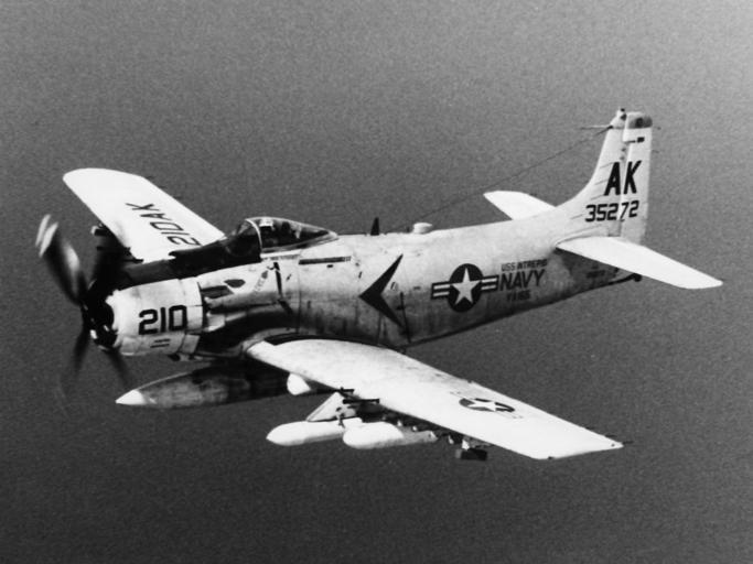 Keywords: A-1H Skyraider of VA-165 off Vietnam in 1966.jpg A U S Navy Douglas A-1H Skyraider BuNo 135272 of Attack Squadron 165 VA-165 Boomers in flight VA-165 was assigned to Carrier Air Wing 10 CVW-10 aboard the aircraft carrier USS Intrepid CVS-11 for a deployment to Vietnam from 4 April to 21 November 1966 <br>The A-1H 135272 was later transferred to the U S Air Force as s/n 52-135272 It served with the 6th Air Commando Squadron 14th Air Commando Wing and was shot down by ground fire near the Kham Duc Special Forces Camp Quang Tin Province South Vietnam on 12 May 1968 The pilot bailed out and was rescued by a U S Army helicopter http //collections naval aviation museum/emuwebdoncoms/pages/doncoms/AdvQuery php U S Navy National Museum of Naval Aviation photo No http //collections naval aviation museum/emuwebdoncoms/pages/doncoms/Display php irn 16002120 QueryPage 2Femuwebdoncoms 2Fpages 2Fdoncoms 2FAdvQuery php 1996 253 2847 1966 U S Navy PD-USGov-Military-Navy AD-6 A-1H Skyraider Attack Squadron 165 United States Navy Vietnam War in 1966 |