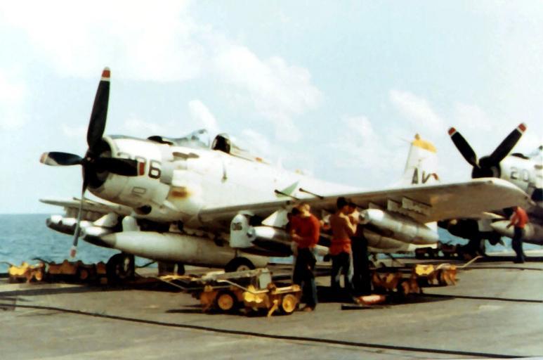 Keywords: A-1H of VA-165 is armed on USS Intrepid (CVS-11) 1966.jpg A U S Navy Douglas A-1H Skyraider BuNo 137534 of Attack Squadron 165 VA-165 Boomers is armed with napalm canisters aboard the the aircraft carrier USS Intrepid CVS-11 VA-165 was assigned to Carrier Air Wing 10 CVW-10 aboard the Intrepid for a deployment to Vietnam from 4 April to 21 November 1966 <br>On 2 September 1966 the A-1H 137534 was hit by ground fire near Vinh Son 16 km west of Mu Ron Ma Quang Binh Province North Vietnam The pilot was able to fly out to the Gulf of Tonkin where he bailed out and was rescued by a U S Navy helicopter http //collections naval aviation museum/emuwebdoncoms/pages/doncoms/AdvQuery php U S Navy National Museum of Naval Aviation photo No http //collections naval aviation museum/emuwebdoncoms/pages/doncoms/Display php irn 16002122 QueryPage 2Femuwebdoncoms 2Fpages 2Fdoncoms 2FAdvQuery php 1996 253 2849 1966 U S Navy PD-USGov-Military-Navy AD-6 A-1H Skyraider Attack Squadron 165 United States Navy Aboard USS Intrepid CV-11 Napalm Vietnam War in 1966 |