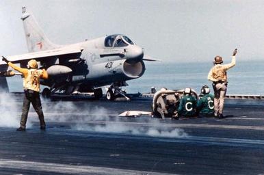 Keywords: A-7E VA-94 on cat of USS Enterprise (CVN-65) 1988.jpeg An armed U S Navy LTV A-7E Corsair II from Attack Squadron VA-94 Shrikes is lauched from the aircraft carrier USS Enterprise CVN-65 during Operation Praying Mantis on 18 April 1988 in the Persian Gulf VA-94 was assigned to Carrier Air Wing 11 CVW-11 aboard the Big E for a deployment to the Western Pacific and the Indian Ocean from 5 January to 3 July 1988 http //collections naval aviation museum/emuwebdoncoms/pages/doncoms/AdvQuery php U S Navy National Museum of Naval Aviation photo No http //collections naval aviation museum/emuwebdoncoms/pages/doncoms/Display php irn 6366 QueryPage 2Femuwebdoncoms 2Fpages 2Fdoncoms 2FAdvQuery php 1996 253 7073 022 1988-04-18 U S Navy PD-USGov-Military-Navy A-7E Corsair II Strike Fighter Squadron 94 United States Navy USS Enterprise CVN-65 flight deck Operation Praying Mantis |