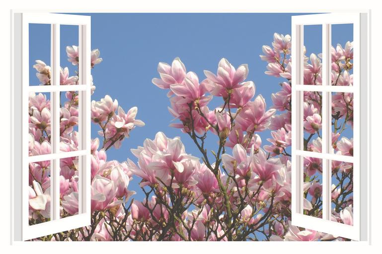 Keywords: a beautiful day good mood joy magnolia tree flowers window spring colorful flowers pink a beautiful morning garden white magnolia outlook window frames open colorful farbenpracht horticulture benefit from photo montage