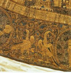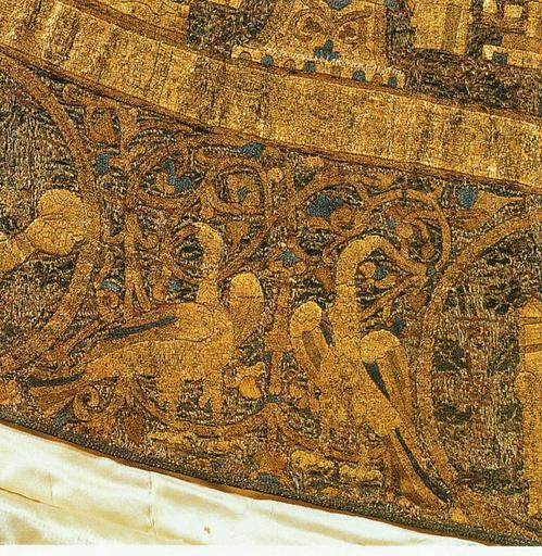 Keywords: A bird-couple on the edge of the coronation pall.jpg author 1031 textile embroidery Institution Hungarian National Museum Budapest object history credit line accession number own scanned by Szilas from A magyar Szent Korona by Tóth Endre Szelényi Károly Kossuth 2000 Budapest PD-old-100 Coronation pall of Hungary |