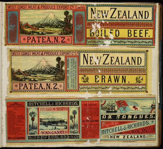 Keywords: text sign street sign photo border writing Top two labels show the same scene of Mt Taranaki, framed between a Maori whare and a cabbage tree (probably based on Allom's lithograph of Heaphy's view of Mt Egmont). As well there are decorative panels of an Oriental style. Bottom label shows a view of the central mountain plateau, with a ship coming into harbour in the foreground. This view is flanked by pictures of a cabbage tree and a tree fern. There is a picture of a ship entering a port (possibly an English port) on the other half of the label. Quantity: 3 colour art print(s) on labels.. Physical Description: Chromolithographs, on labels, 94 x 340 mm; 105 x 325 mm; and, 109 x 344 mm. Provenance: Deposited by Gear Meat Company in 1981. Archibald Dudingston Willis (Firm). A D Willis (Wanganui) :[Three labels - West Coast Meat & Produce Export Co Ltd (Patea). New Zealand boiled beef, and New Zealand brawn; and, Mitchell & Richards Tinned Meats, Wanganui. Ox tongues. 1890-1920].. Gear Meat Company :Scrapbook of labels. 1890s-1920s].. Ref: Eph-F-MEAT-Gear-046. Alexander Turnbull Library, Wellington, New Zealand. natlib.govt.nz/records/23084706 Top two labels show the same scene of Mt Taranaki, framed between a Maori whare and a cabbage tree (probably based on Allom's lithograph of Heaphy's view of Mt Egmont). As well there are decorative panels of an Oriental style. Bottom label shows a view of the central mountain plateau, with a ship coming into harbour in the foreground. This view is flanked by pictures of a cabbage tree and a tree fern. There is a picture of a ship entering a port (possibly an English port) on the other half of the label. Quantity: 3 colour art print(s) on labels.. Physical Description: Chromolithographs, on labels, 94 x 340 mm; 105 x 325 mm; and, 109 x 344 mm. Provenance: Deposited by Gear Meat Company in 1981. Archibald Dudingston Willis (Firm). A D Willis (Wanganui) :[Three labels - West Coast Meat & Produce Export Co Ltd (Patea). New Zealand boiled beef, and New Zealand brawn; and, Mitchell & Richards Tinned Meats, Wanganui. Ox tongues. 1890-1920].. Gear Meat Company :Scrapbook of labels. 1890s-1920s].. Ref: Eph-F-MEAT-Gear-046. Alexander Turnbull Library, Wellington, New Zealand. natlib.govt.nz/records/23084706 |