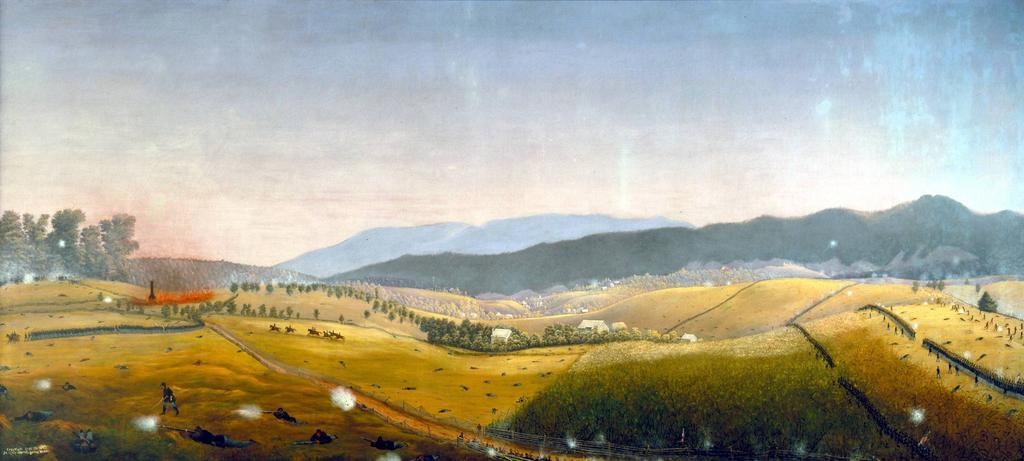Keywords: A Fateful Turn by Captain James Hope.jpg en A Fateful Turn-Late morning looking east toward the Roulette Farm Amid the smoke noise and confusion on the northern end of the field Union troops turned south toward an old sunken farm lane The rolling terrain helped hide the Southern troops until the Northerners were almost on top of them Suddenly the Confederates unleashed a withering fire leading to a desperate three-hour struggle for control of what came to be known as Bloody Lane The burning Mumma Farm is seen on the left and Gen George McClellan is riding with his staff on his only visit onto the battlefield that day at about 2 00 pm On the right Richardson's and French's Union Divisions advancing on Bloody Lane http //www nps gov/anti/photosmultimedia/hopepaintings htm eid 101853 root_aId 30 Hope Paintings at nps gov Captain James Hope d 1892 circa 1862 1892 PD-art Battle of Antietam Paintings of the American Civil War |