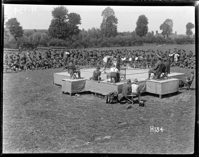 Keywords: blackandwhite monochrome outdoor photo border black and white Fighting in the ring at the Divisional boxing championships in Doulieu, France. Long view showing the boxing ring, judges and spectators. Photograph taken 6 or 10 July 1917 by Henry Armytage Sanders. Inscriptions: Inscribed - Photographer's title on negative -bottom right: H134. Quantity: 1 b&w original negative(s). Physical Description: Dry plate glass negative 4 x 5 inches A fight underway at the New Zealand Division boxing championships in France during World War I. Royal New Zealand Returned and Services' Association :New Zealand official negatives, World War 1914-1918. Ref: 1/2-012844-G. Alexander Turnbull Library, Wellington, New Zealand. natlib.govt.nz/records/22314487 Fighting in the ring at the Divisional boxing championships in Doulieu, France. Long view showing the boxing ring, judges and spectators. Photograph taken 6 or 10 July 1917 by Henry Armytage Sanders. Inscriptions: Inscribed - Photographer's title on negative -bottom right: H134. Quantity: 1 b&w original negative(s). Physical Description: Dry plate glass negative 4 x 5 inches A fight underway at the New Zealand Division boxing championships in France during World War I. Royal New Zealand Returned and Services' Association :New Zealand official negatives, World War 1914-1918. Ref: 1/2-012844-G. Alexander Turnbull Library, Wellington, New Zealand. natlib.govt.nz/records/22314487