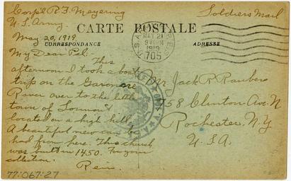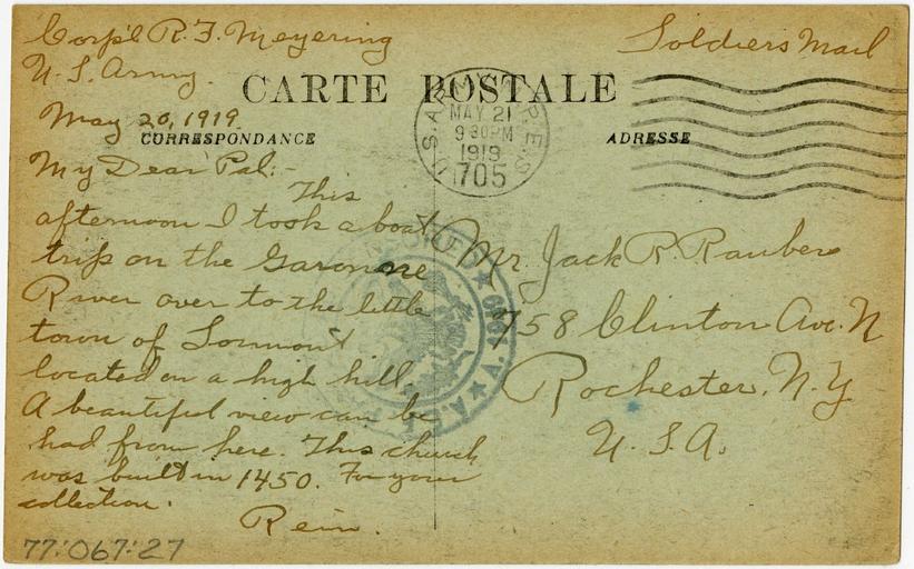Keywords: george_eastman_house georgeeastmanhouse armistice day armisticeday soldiers mail soldiersmail carte postale cartepostale post card postcard corporal r.j. meyering rjmeyering may 20, 1919 may201919 1919 rein france rochester ny rochesterny post mark postmark jack r. ranbers jackrranbers color:rgb_avg=aea877 color:rgbavg=aea877 document text writing indoor Accession Number: 1977:0067:0027v Maker: Unidentified Photographer Title: A.H. 3 - LORMONT - Place de L'?lise Date: ca. 1916 Medium: collotype print Dimensions: Overall: 8.7 x 13.9 cm George Eastman House Collection General – information about the George Eastman House Photography Collection is available at www.eastmanhouse.org/inc/collections/photography.php. For information on obtaining reproductions go to: www.eastmanhouse.org/flickr/index.php?pid=1977:0144:0050MP. Accession Number: 1977:0067:0027v Maker: Unidentified Photographer Title: A.H. 3 - LORMONT - Place de L'?lise Date: ca. 1916 Medium: collotype print Dimensions: Overall: 8.7 x 13.9 cm George Eastman House Collection General – information about the George Eastman House Photography Collection is available at www.eastmanhouse.org/inc/collections/photography.php. For information on obtaining reproductions go to: www.eastmanhouse.org/flickr/index.php?pid=1977:0144:0050MP. |