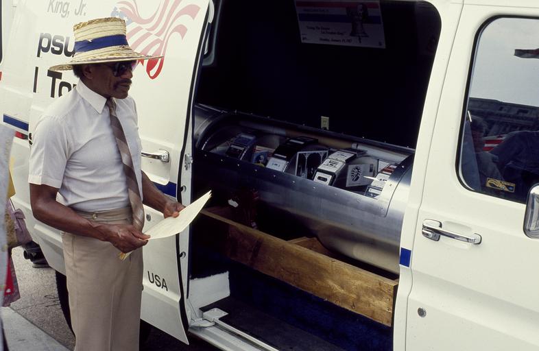 | Keywords: A man looks at the time capsule holding some of Dr. Martin Luther King, Jr.'s possessions that was lowered into the ground at Freedom Plaza on Pennsylvania Avenue, Washington, D.C. in 1988 LCCN2011632731.tif 1 transparency color ; 4 x 5 in or smaller Notes Title date and keywords provided by the photographer ; Digital image produced by Carol M Highsmith to represent her original film transparency; some details may differ between the film and the digital images ; Forms part of the Selects Series in the Carol M Highsmith Archive ; Gift and purchase; Carol M Highsmith; 2011; DLC/PP-2011 124 ; Credit line Photographs in the Carol M Highsmith Archive Library of Congress Prints and Photographs Division 1988 Creator Carol M Highsmith Library of Congress Catalog http //lccn loc gov/2011632731 Image download https //cdn loc gov/master/pnp/highsm/17300/17317a tif Original url http //hdl loc gov/loc pnp/highsm 14537 No known restrictions on publication LOC-image highsm 14537 220px PD-Highsmith Images uploaded by Fæ Photographs by Carol M Highsmith |