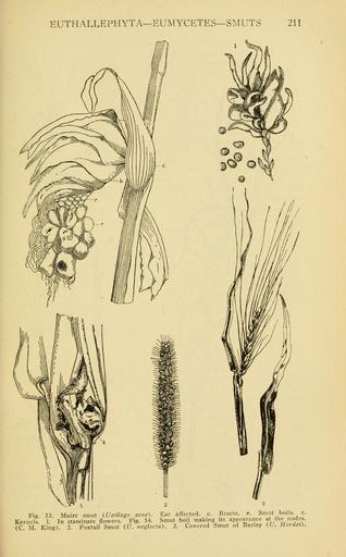 | Keywords: A manual of poisonous plants (Page 211) (6004760547).jpg EUTHALLEPHYTA ”EUMYCETES ” SMUTS 211 <br> Kernels <br> C <br> Fig 53 Maize smut Ustilago zcae Ear affected c Bracts e Smut boils r <br> lels 1 In staminate flowers Fig 54 Smut boil making its appearance at the nodes <br> M King 2 Foxtail Smut f/ neglecta 3 Covered bmut of Barley t/ Hoidei 11346807 42239 10913 Page 211 Text http //www biodiversitylibrary org/page/11346807 1911 10 5962/bhl title 10913 Pammel L H NameFound Eumycetes NameFound Euthallephyta NameFound Ustilago NameConfirmed Ustilago EOLID 16579 NameBankID 2561267 Biodiversity Heritage Library A manual of poisonous plants Poisonous plants United States Mertz Library The New York Botanical Garden bhl page 11346807 dc identifier http //biodiversitylibrary org/page/11346807 united states mertz library the new york botanical garden Information field Flickr posted date ISOdate 2011-08-03 Check categories 2015 September 10 CC-BY-2 0 BioDivLibrary https //flickr com/photos/61021753 N02/6004760547 2015-09-10 19 56 06 cc-by-2 0 PD-old-70-1923 A manual of poisonous plants Photos uploaded from Flickr by Fæ using a script |
