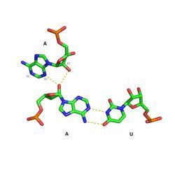 Keywords: A-minor-motif type0.png en RNA A-minor motif type 0 interaction Notice the hydrogen bonding limited to the N2 and 2'OH of the intercalating A base This interaction is clearly less specific and less strong than the A-minor type 1 own DunicanBF 2009-11-10 Free license file modified created from Protein Data Bank accession number 1FFK RNA Hydrogen bonding |