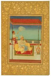 Keywords: A portrait of Takoji Holkar smoking a hookah under a canopy,.JPG en A portrait of Takoji Holkar smoking a hookah under a canopy India Delhi early 19th century Estimate 2 000 - 3 000 GBP LOT SOLD 6 000 GBP Hammer Price with Buyer's Premium Gouache with gold on paper inscription of identification in nast`aliq at upper centre Takoji Howalkar Subedar mounted on an album page with borders of stout cream paper decorated with gold flowers reverse with an inscription in an English hand in brown ink probably William Fraser's hand Tukojee Holker painting 28 by 19cm leaf 45 9 by 30 4cm early 19th century http //www sothebys com/en/auctions/ecatalogue/2012/arts-of-the-islamic-world-2012/lot 90 html India Delhi PD-Art Uploaded with UploadWizard Tukoji Rao Holkar William Fraser Images from Sotheby's |