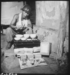 | Keywords: A soldier of the Republic of Korea Army eating lunch in a war-destroyed house in Munsan-ni, Korea, as a field ration... - NARA - 530635.tif Scope and content General notes Use War and Conflict Number 1473 when ordering a reproduction or requesting information about this image 530635 Local identifier 111-C-6560 Department of Defense Department of the Army Office of the Deputy Chief of Staff for Operations U S Army Audiovisual Center ca 1974 - 05/15/1984 Still Picture Records Section Special Media Archives Services Division NWCS-S National Archives at College Park 8601 Adelphi Road College Park MD 20740-6001 1951-07-17 Record group Record Group 111 Records of the Office of the Chief Signal Officer 1860 - 1985 Record group ARC 440 Color Photographs of Signal Corps Activity compiled 1944 - 1981 Series ARC 530606 File unit File unit ARC Variant control numbers NAIL Control Number NWDNS-111-C-6560 yes Other versions NARA-cooperation PD-USGov Korean War Military life Soldiers eating |