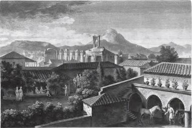 Keywords: A Stoa or Portico - James Athenian Stuart.JPG en engraving by James Stuard with a view of Athens in the late 18h century el Ο ίνακας εικονίζει το το ίο της Αθήνας ό ως φαίνεται α ό το αράθυρο της οικίας του ρέσβη της Βρετανίας στην Αθήνα ικόλα Λογοθέτη Βλέ ουμε τις αυλές α οθήκες στάβλους και εργαστήρια σα ωνο οιίας των γειτονικών σ ιτιών Ένας Αγάς δέχεται την ε ίσκεψη κά οιου Τούρκου Κάθονται κάτω α ό ένα υ όστεγο κιόσκι ο ε ισκέ της στα αριστερά Ένας υ ηρέτης ροσφέρει μια μεγάλη ί α στον ε ισκέ τη του Αγά ενώ ένας άλλος έρχεται με τον καφέ και ένας τρίτος ιο ίσω κρατάει γλυκό του κουταλιού και μια ετσέτα Στον στάβλο δεξιά βλέ ουμε έναν Αλβανό ι οκόμο με τα άλογα του αφέντη του <br> Το αρχαίο μνημείο στο βάθος είναι κατεστραμμένο στο δεξί μισό εκεί ου υψώνεται μια αψίδα Η αριστερή βόρεια τέρυγα είναι διακοσμημένη με κίονες κορινθιακού ρυθμού Στο μνημείο είναι ενσωματωμένη μια χριστιανική εκκλησία Στην ύλη ήταν αναρτημένη κά οτε η καμ άνα της εκκλησίας αλλά οι Τούρκοι την α αγόρευσαν και την αφαίρεσαν α ό το καμ αναριό Στο βάθος βλέ ουμε το Πεντελικό όρος με την ονή της Πεντέλης στους ρό οδες και το ερίφημο λατομείο στην κορυφή Το σκουρόχρωμο βουνό είναι το Ψυχικό με ένα εκκλησάκι Στον Υμηττό ανάμεσα σε δύο κορφές βρίσκεται η ονή του Άγιου Ιωάννη του Κυνηγού <br> Ο Στούαρτ μας αναφέρει ότι οι Αθηναίοι ονόμαζαν τις στήλες αυτές «Παλάτι του Περικλή» ή «του Θεμιστοκλή» ενώ οι εριηγητές τις ερμήνευαν ως « αό του Ολυμ ίου Διός» Ο ίδιος όμως στην εριγραφή του το ερμήνευσε ως αρχαία ερεί ια κά οιας στοάς και καταλήγει ακολουθώντας την εριγραφή του Παυσανία στο συμ έρασμα ότι το οικοδόμημα αυτό ήταν Στοά μέλος της αρχαίας Αγοράς και συγκεκριμένα ρόκειται για την Ποικίλη Στοά http //www archive org/details/antiqvitiesAthe1Stua this book http //www archive org/stream/antiqvitiesAthe1Stua page/I/mode/1up this page Creator James Stuart 1762 PD-old-100 James Stuart 1713-1788 Engraving of Athens 1762 Historical images of Greece Athens
