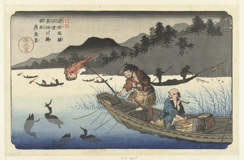Keywords: Aalscholvervissersboten op de Nagae rivier te Kawado-Rijksmuseum RP-P-1956-715.jpeg accession number RP-P-1956-715 Keisai Eisen; Keisai Eisen died 1848; Takenouchi Magohachi Hoeido credit line GWToolset Rijksmuseum nl Vissersboot met pijp rokende man kijkend naar vier aangelijnde aalscholvers vastgehouden door tweede man; bij nacht Op de achtergrond meer vissersboten De vissen aangetrokken door het vuur bij de boot worden door de aalscholvers uit het water gepikt; hun afgeklemde nek voorkomt dat ze de vis doorslikken Label Line mentioned on object Keisai Eisen 1790 - 1848 1838 - 1842 kleurenhoutsnede; lijnblok in zwart met kleurblokken Collection prenten; Japan collectie en Fishing boats for cormorants on the Nagae river at Kawado; fishing boat with pipe smoking man looking at cormorants on a leash held fast by a second man; at night; on the background more fishing boats The fishes attracted by the fire near the boat are being picked by the cormorants from the water their pinched throat prevents them from swallowing the fish blad Height mm 232 blad Width mm 364 exhibition history paper object history Acquisition 1956 object type PD-US PD-old Data and photography rights All data and all images made available through the API are either in the public domain or are subject to a CC0 license https //www rijksmuseum nl/en/api/terms-and-conditions-of-use cc-zero place of creation Japan; Tokyo http //www rijksmuseum nl/collectie/RP-P-1956-715 http //hdl handle net/10934/RM0001 COLLECT 46235 handle Aalscholvervissersboten op de Nagae rivier te Kawado Uploaded with GWToolset Rijksmuseum RP-P-1956-715 http //www rijksmuseum nl/media/assets/RP-P-1956-715 Images uploaded by Fæ Japanese 19th-century prints in the Rijksmuseum Amsterdam Images from the Rijksmuseum |