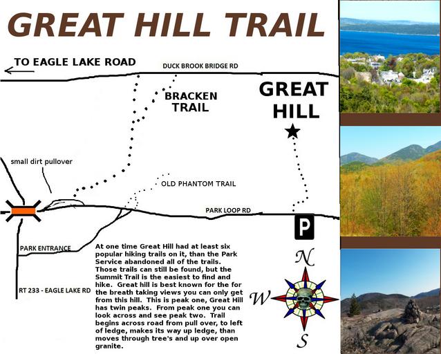 | Keywords: great hill trail greathilltrail trenton bar harbor airport barharborairport park loop road parklooproad ghost trails ghosttrails phantom trails phantomtrails lost trails losttrails abandoned trails abandonedtrails maps of acadia mapsofacadia acadia national park acadianationalpark mount desert island mountdesertisland outdoor text I wish the Great fire of 47 had never happened because following that fire many of the once popular hiking trails in Acadia National Park were abandoned. Great Hill is a great example of this, once home to about a dozen hiking trails such as the Great Hill summit trail, the Bracken trail, and the Fern Trail to name a few, today there are no official trails on Great Hill. To locate the start of the Great Hill summit trail, drive out of down town Bar Harbor along route 233 - The Eagle Lake road. Just before a large arched stone bridge, turn right into Acadia National Park. Now turn right onto the Park Loop Road, and drive just around the corner and park at the pull over with a sign about the seasons. Directly across the roadway is a granite ledge, to the left hand corner of that ledge is an area where you can make your way up on the ledge, look away from the road and toward the tree's, there is an opening and just beyond that flat granite which sloops upward. There really is only one way up you can go and as you make your way upward you will come to well worn spots along the way. Great Hill is a hill with twin summits, standing on summit one you can look across and see summit two. Also the views are completely different from each summit. From summit one where the trail on the map leads, you can sit at night and watch as planes land and take off in the distance from the Bar Harbor airport (located off island in Trenton). I wish the Great fire of 47 had never happened because following that fire many of the once popular hiking trails in Acadia National Park were abandoned. Great Hill is a great example of this, once home to about a dozen hiking trails such as the Great Hill summit trail, the Bracken trail, and the Fern Trail to name a few, today there are no official trails on Great Hill. To locate the start of the Great Hill summit trail, drive out of down town Bar Harbor along route 233 - The Eagle Lake road. Just before a large arched stone bridge, turn right into Acadia National Park. Now turn right onto the Park Loop Road, and drive just around the corner and park at the pull over with a sign about the seasons. Directly across the roadway is a granite ledge, to the left hand corner of that ledge is an area where you can make your way up on the ledge, look away from the road and toward the tree's, there is an opening and just beyond that flat granite which sloops upward. There really is only one way up you can go and as you make your way upward you will come to well worn spots along the way. Great Hill is a hill with twin summits, standing on summit one you can look across and see summit two. Also the views are completely different from each summit. From summit one where the trail on the map leads, you can sit at night and watch as planes land and take off in the distance from the Bar Harbor airport (located off island in Trenton). |