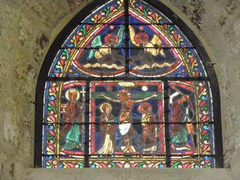 Keywords: Abbatiale Saint-Pierre d'Orbais-l'Abbaye (51) Verrière du Calvaire.jpg le Christ en croix entre la Vierge et St-Jean De part et d'autre l'Église et la Synagogue Au sommet deux anges own GO69 01/12/2010; pour le vitrail vers 1215 IM51000599 verrière Cc-zero Vitraux de l'abbatiale Saint-Pierre d'Orbais-l'Abbaye Taken with Olympus SP-590UZ |