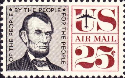 Keywords: Abraham Lincoln Airmail 1960 Issue-25c.jpg U S Postage Issue Abraham_Lincoln_Airmail_1960_Issue-25c jpg U S Post Office; Hi-res scan of U S postage stamp from private collection 1960-04-22 U S Bureau of Engraving and Printing; Imaging by Gwillhickers Public Domain Airmail stamps of the United States Abraham Lincoln on stamps Stamps of the United States 1951-1960 Stamps of the American Civil War PD-USGov |