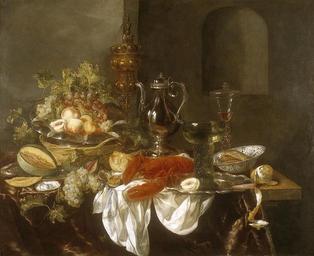 Keywords: Abraham van Beijeren 012.jpg Artwork Creator Abraham van Beijeren between 1650 1670 Oil on canvas cm 102 5 121 Institution Museum Het Prinsenhof 185 Stilleven met zilver- en glaswerk kreeft fruit en een porseleinen schaal op een donker kleed met wit servet Other date decade 1650 - decade 1660 1650-1669 cm 102 5 121 li002434 Früchtestilleben mit Hummer Pokalen und Weinkanne Other date ~ 1645 cm 101 121 795 LangSwitch Still life with gilt cup silver ewer and lobster Stilleven met vergulde bokaal zilveren kan en kreeft second half Other date century 17 cm 102 5 121 object history - 1923 1942-07-21 J J M Chabot Montreux / Brussels - 1923 1943 loan LangSwitch das the au het Rijksmuseum Amsterdam Amsterdam inv 506 A ProvenanceEvent 1942-07-21 acquisition LangSwitch das the le het Führermuseum Linz inv 2425 Erhard Göpel The Hague ProvenanceEvent 1945 transfer LangSwitch das the le het Central Collecting Point Munich inv 4467 - 1945 1948 Stichting Nederlands Kunstbezit Netherlands today Rijksdienst voor het Cultureel Erfgoed Rijswijk inv 815 ProvenanceEvent 1948 conveyance LangSwitch die the au de Dienst voor 's Rijks Verspreide Kunstvoorwerpen The Hague today Rijksdienst voor het Cultureel Erfgoed Rijswijk inv NK1685 - 1953 1992 loan LangSwitch das the au het Groninger Museum Groningen inv 1953 0059 Dienst voor 's Rijks Verspreide Kunstvoorwerpen The Hague loan LangSwitch das the au ~ Museum Het Prinsenhof Delft inv B 1-115 Rijksdienst voor het Cultureel Erfgoed Rijswijk exhibition history A Prosperous Past 49 credit line AVB f monogram bottom right la accession number B 1-115 geheugenvannederland nl http //geheugenvannederland nl Home http //geheugenvannederland nl/ /en/items/ICN01 2872 Info http //resources21 kb nl/gvn/ICN01/ICN01_NK1685_W jpg Pic PD-old-100 Still life paintings by Abraham van Beijeren 1650 1650s paintings in the Netherlands 1660 paintings Paintings in the Museum Het Prinsenhof Beijeren 17th-century still life paintings in the Netherlands 1650s still life paintings 17th-century oil on canvas paintings in the Netherlands Paintings of lobsters Paintings of melons Niches in art 17th-century still life paintings of fruits 17th-century still life paintings of food Peeled lemons in art Cups in art Paintings of silverware Sonderauftrag Linz |