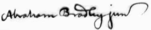Keywords: AbrahamBradleysig.jpg en Signature of Abraham Bradley Jr as it appears on the letter from Bradley to U S President Thomas Jefferson August 28 1805 Library of Congress Thomas Jefferson Papers http //memory loc gov/master/mss/mtj/mtj1/034/0400/0495 jpg Crop by User BusterD of signature by Abraham Bradley Jr 1805-09-28 PD-USGov Signatures of politicians from the United States |