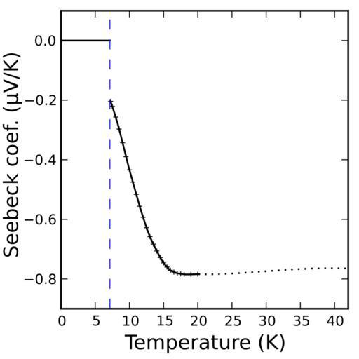 Keywords: Absolute Seebeck coefficient of lead at low temperature.svg en Absolute Seebeck coefficient of lead at low temperature according to Christian Jan Pearson Templeton 1958 0-7 K Seebeck is zero since lead is superconducting 7-20 K Seebeck measured by thermocouple against superconducting niobium-tin 20 K and up Seebeck extrapolated by Christian et al using previous results of Borelius 1932 See File Absolute Seebeck coefficients of various metals up to high temperatures svg for source code 2014-01-11 19 35 10 own Nanite cc-zero Uploaded with UploadWizard Thermoelectricity |