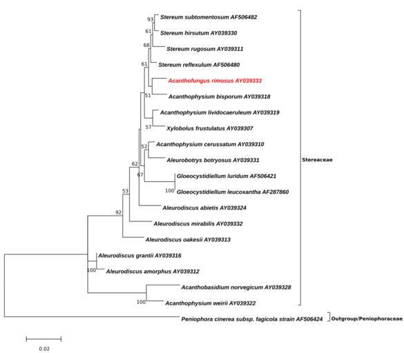 Keywords: Acanthofungus-Maximum Likelihood -Tree.svg Molecular Phylogenetic analysis by Maximum Likelihood method Acanthofungus rimosus and related taxa <br/> The evolutionary history was inferred by using the Maximum Likelihood method based on the Kimura 2-parameter model 1 The tree with the highest log likelihood -2718 2260 is shown The percentage of trees in which the associated taxa clustered together is shown next to the branches Initial tree s for the heuristic search were obtained by applying the Neighbor-Joining method to a matrix of pairwise distances estimated using the Maximum Composite Likelihood MCL approach A discrete Gamma distribution was used to model evolutionary rate differences among sites 5 categories +G parameter 0 5705 The rate variation model allowed for some sites to be evolutionarily invariable +I 60 8784 sites The tree is drawn to scale with branch lengths measured in the number of substitutions per site The analysis involved 20 nucleotide sequences There were a total of 934 positions in the final dataset Evolutionary analyses were conducted in http //megasoftware net/ MEGA6 6 <br/> 1 Kimura M 1980 A simple method for estimating evolutionary rate of base substitutions through comparative studies of nucleotide sequences Journal of Molecular Evolution 16 111-120 <br/> 2 Tamura K Stecher G Peterson D Filipski A and Kumar S 2013 MEGA6 Molecular Evolutionary Genetics Analysis version 6 0 Molecular Biology and Evolution30 2725-2729 <br/> ; List with GenBank Sequences which were used for the ML-Tree http //www ncbi nlm nih gov/nuccore/AY039328 Acanthobasidium norvegicum AY039328 http //www ncbi nlm nih gov/nuccore/AY039333 Acanthofungus rimosus AY039333 http //www ncbi nlm nih gov/nuccore/AY039318 Acanthophysium bisporum AY039318 http //www ncbi nlm nih gov/nuccore/AY039310 Acanthophysium cerussatum AY039310 http //www ncbi nlm nih gov/nuccore/AY039319 Acanthophysium lividocaeruleum AY039319 http //www ncbi nlm nih gov/nuccore/AY039322 Acanthophysium weirii AY039322 http //www ncbi nlm nih gov/nuccore/AY039331 Aleurobotrys botryosus AY039331 http //www ncbi nlm nih gov/nuccore/AY039324 Aleurodiscus abietis AY039324 http //www ncbi nlm nih gov/nuccore/AY039312 Aleurodiscus amorphus AY039312 http //www ncbi nlm nih gov/nuccore/AY039316 Aleurodiscus grantii AY039316 http //www ncbi nlm nih gov/nuccore/AY039332 Aleurodiscus mirabilis AY039332 http //www ncbi nlm nih gov/nuccore/AY039313 Aleurodiscus oakesii AY039313 http //www ncbi nlm nih gov/nuccore/AF287860 Gloeocystidiellum leucoxantha AF287860 http //www ncbi nlm nih gov/nuccore/AF506421 Gloeocystidiellum luridum AF506421 http //www ncbi nlm nih gov/nuccore/AF506424 Peniophora cinerea subsp fagicola strain AF506424 http //www ncbi nlm nih gov/nuccore/AY039330 Stereum hirsutum AY039330 http //www ncbi nlm nih gov/nuccore/AF506480 Stereum reflexulum AF506480 http //www ncbi nlm nih gov/nuccore/AY039311 Stereum rugosum AY039311 http //www ncbi nlm nih gov/nuccore/AF506482 Stereum subtomentosum AF506482 http //www ncbi nlm nih gov/nuccore/AY039307 Xylobolus frustulatus AY039307 own 2014-08-22 Thkgk Cc-zero Acanthofungus Acanthofungus rimosus |
