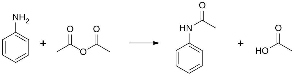 Keywords: Acetanilide syntheses.svg Chemical reaction between aniline and acetic anhydride to produce acetanilide and acetic acid Own 12 32 25 August 2014 UTC Ed Edgar181 Reactions of aniline Amide formation reactions Acetanilide