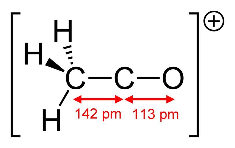 Keywords: Acetylium-ion-dimensions-from-G3(MP2)-2D.png Bond lengths of the acetylium cation MeCO<sup>+</sup> C<sub>2</sub>H<sub>3</sub>O<sup>+</sup> G3 MP2 method-computed structure from http //dx doi org/10 1021/jp802086z J Phys Chem A 2008 112 27 pp 6066 “6073 Image generated in http //accelrys com/products/discovery-studio/visualization/discovery-studio-visualizer html Accelrys DS Visualizer Own 2009-03-15 Ben Mills Benjah-bmm27 Images by Ben Mills Acetylium ion |