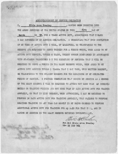 | Keywords: Acknowledgement of service obligation sgned by Elvis Presley on March 24, 1958, to indicate that he understands that... - NARA - 299792.tif Elvis Presley on March 24 1958 to indicate that he understands that his total service obligation both active and reserve is 6 years Scope and content General notes Original signature 299792 Local identifier Department of Defense Department of the Army U S Total Army Personnel Command 12/08/1988 - 10/01/2003 NARA's National Personnel Records Center Military Personnel Records NRPM 9700 Page Avenue St Louis MO 63132-5100 1958 03 24 - 1958 03 24 Record group Record Group 319 Records of the Army Staff 1903 - 2009 Record group ARC 633 Official Military Personnel Files compiled 1912 - 1998 Series ARC 299741 File unit Official Military Personnel File of Elvis A Presley ca 1958 - ca 1960 File unit ARC 299786 Variant control numbers NAIL Control Number NRPM-319-OMPF-PRESLEYEA-PRESLEYACKNOW yes Other versions <gallery> File Acknowledgement_of_service_obligation_sgned_by_Elvis_Presley_on_March_24 _1958 _to_indicate_that_he_understands_that _-_NARA_-_299792 tif tif File Acknowledgement_of_service_obligation_sgned_by_Elvis_Presley_on_March_24 _1958 _to_indicate_that_he_understands_that _-_NARA_-_299792 jpg jpg </gallery> NARA-cooperation PD-USGov Elvis Presley Documents in English NARA TIF images with categorized JPGs |