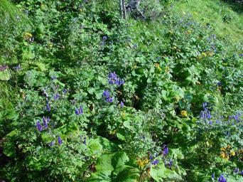 Keywords: Aconitum and Ligularia dentata in Mount Hijiri 2002-08-14.jpg Aconitum and Ligularia dentata in Mount Hijiri ホソバトリカブトとマルバ ケブキ 聖平にて Own Alpsdake 2002-08-14 Cc-zero Ligularia dentata Unidentified Aconitum Flora of Mount Hijiri