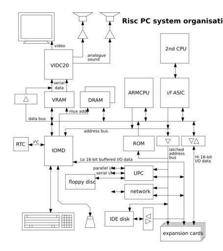 Keywords: Acorn-RiscPC-System-Organisation.svg en A diagram of the logical organisation of the Acorn Risc PC Based upon the information from ARM System Architecture by Steve Furber own Peter Howkins 10/2/2013 Acorn Computers Computer architecture diagrams |
