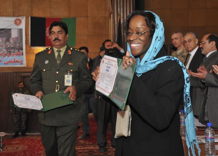 | Keywords: Acquisition & Resource Management Course graduation 130306-N-WJ362-027.jpg en Alice Rice a U S Department of Defense civilian assigned to NATO Training Mission-Afghanistan receives a Certificate of Achievement Mar 6 2013 for advising at the Acquisition Resource Management Course held at Kabul Military High School from January through early March 2013 U S Navy Photo by Mass Communication Specialist 2nd Class SW/AW Kleynia R McKnight 2013-03-06 Petty Officer 2nd Class Kleynia McKnight https //www dvidshub net/image/881080 130306-N-WJ362-027 2013-03-07 08 15 KABUL AF PD-USGov-Military-Navy NATO Training Mission - Afghanistan Images from DoD uploaded by Fæ |