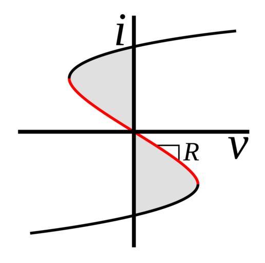 Keywords: Active negative resistance - current controlled.svg Current-voltage IV diagram of a linear negative resistance produced at the port of an amplifier with positive feedback The curve has a straight line segment through the origin with negative slope -R so applying a voltage v to the amplifier causes a proportional current i to flow out of the positive terminal the opposite of an ordinary positive resistance The device has both negative differential resistance grey region and negative static resistance <font color red >red</font> region <br /> <math>R v \over i \Delta v \over \Delta i < 0 \ </math> Applying a large enough current of either polarity to it moves the amplifier into nonlinear regions of the curve saturating the amplifier so the resistance becomes positive black portion of curve This type of negative resistance is found in feedback oscillators negative impedance converters and active filters own Chetvorno 2013-07-22 Negative resistance Device current-voltage characteristics Cc-zero |