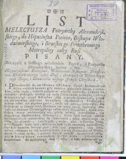 | Keywords: Adam Potiy 1276.jpg Адам Іпатій Потій Лист до пат іа ха елетиуша Почаїв 1788 С 1 З особистої бібліотеки І Ф анка Adam Potiy Letter to Patriarch Meleciusz From Ivan Franko personal Library 1788 Institution Shevchenko Institute of Literature Digital Collection PD-old-70-1923 Books from Ukraine Franko Personal Library Collections of books in libraries in Ukraine Shevchenko Institute of Literature Uploaded with VicuñaUploader | ||||