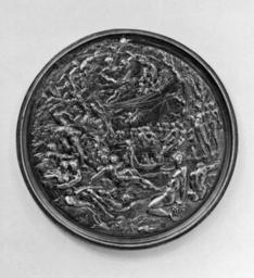 Keywords: Adam van Vianen - Plaque with the Wedding of Peleus and Thetis - Walters 542399.jpg The Olympian gods celebrate the wedding of Peleus and Thetis In the foreground amorous couples embrace and toast the young couple while flying cupids fill the air The seated youth on the right with a cluster of grapes is Bacchus god of wine Eris goddess of discord arrives uninvited at the left Into the midst of the revelers she will throw a golden apple inscribed to the fairest leading to the Judgment of Paris and eventually to the Trojan War The exquisitely choreographed scene is based on a composition by the Utrecht painter Abraham Bloemaert 1566-1651 translated into a circular relief by the silversmith Adam van Vianen between 1595 1600 Renaissance bronze cm 18 4 d accession number 54 2399 38551 Count Pepoli Bologna date and mode of acquisition unknown French Company Inc Mr Milton Samuels New York date and mode of acquisition unknown Walters Art Museum 1954 by purchase Museum purchase with funds provided by the S A P Fund 1954 The Mannerists Fort Wayne Art Museum Indiana Fort Wayne; Allen Memorial Art Museum Oberlin 1963-1965 place of origin Utrecht Netherlands Walters Art Museum license Renaissance reliefs in the Walters Art Museum Plaquettes Adam van Vianen Peleus Thetis Bronze plaques Bacchus Eris mythology Media contributed by the Walters Art Museum needs artist review Black and white photographs Marriage of Peleus and Thetis Reliefs of nude men Nude females in reliefs Reliefs of nude children |