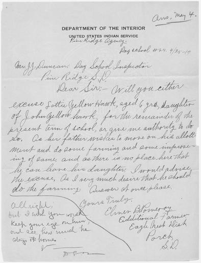 Keywords: Additional Farmer Elmer B. Pomeroy, Eagle Nest District, Porch, South Dakota, to J.J. Duncan. - NARA - 284455.tif Scope and content General notes 284455 Local identifier Department of the Interior Office of Indian Affairs Pine Ridge Agency 1878 - 09/17/1947 NARA's Central Plains Region Kansas City NREA 400 West Pershing Road Kansas City MO 64108 1914-04-25 Record group Record Group 75 Records of the Bureau of Indian Affairs 1793 - 1999 Record group ARC 404 Correspondence of the Day School Inspector J J Duncan compiled 02/09/1910 - 09/06/1916 Series ARC 283922 File unit Correspondence of Day School Inspector J J Duncan January 4 1914 to September 30 1914 01/04/1914 - 09/30/1914 File unit ARC 284437 Variant control numbers NAIL Control Number NRE-75-169-G-18 yes Other versions NARA-cooperation PD-USGov Check categories-NARA 2011 September 16 Documents in English Manuscripts |
