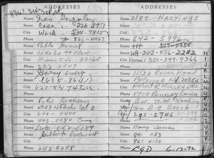 Keywords: Address Book of Watergate Burglar Bernard Barker, Discovered in a Room at the Watergate Hotel, June 18, 1972 - NARA - 304966.tif Scope and content This address book lists HH initials for Howard Hunt a White House consultant After confirming that the telephone number listed here was indeed at the White House the FBI linked the Watergate break-in to the White House during the investigation's earliest hours General notes Exhibit History American Originals December 1997 - December 1998 National Archives Rotunda Washington DC Exhibit No 624 0217 Recent America June 1984 - December 1985 National Archives Rotunda Washington DC Exhibit No 533 0374 304966 Local identifier U S District Court for the District of Columbia 1936 - Special Access/FOIA Section Textual Archives Services Division NWCTF National Archives at College Park 8601 Adelphi Road College Park MD 20740-6001 Record group Record Group 21 Records of District Courts of the United States 1685 - 2004 Record group ARC 350 Watergate-Related Cases compiled 06/1972 - 1986 Series ARC 304963 File unit United States versus G Gordon Liddy Eugenio Martinez Frank Sturgis E Howard Hunt James McCord Bernard Barker and Virgilio Gonzalez 06/1972 - 1986 File unit ARC 304964 Variant control numbers NAIL Control Number NWCTF-21-USDISTCTDC-CRUSVLIDDY-GOVEX38<br /> NAIL Control Number NWDDA-21-USDISTCTDC-CR-USVLIDDY-GOVEX38<br /> Search Identifier siLearning Center<br /> Search Identifier siNational History Standard Era 10 yes Other versions <gallery> File Address_Book_of_Watergate_Burglar_Bernard_Barker _Discovered_in_a_Room_at_the_Watergate_Hotel _June_18 _1972_-_NARA_-_304966 tif tif File Address_Book_of_Watergate_Burglar_Bernard_Barker _Discovered_in_a_Room_at_the_Watergate_Hotel _June_18 _1972_-_NARA_-_304966 jpg jpg </gallery> NARA-cooperation PD-USGov Watergate scandal Documents in English Address books NARA TIF images with categorized JPGs |