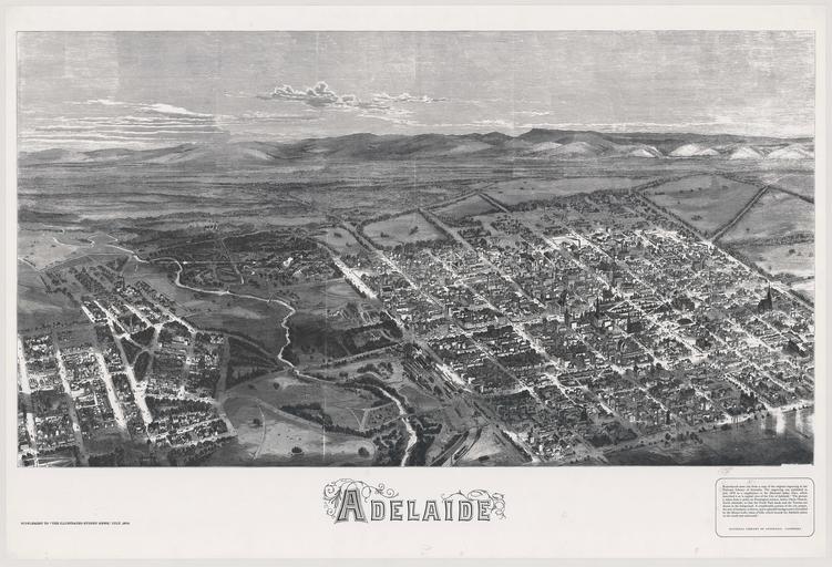 | Keywords: Adelaide supplement to the Illustrated Sydney News.png en In July 1876 the Illustrated Sydney News published a special supplement that included an early aerial view of the City of Adelaide the River Torrens and portion of North Adelaide from a point on Pennington Terrace North Adelaide Although the map is not drawn to scale the detail and oblique drawing technique give a fascinating impression of what Adelaide was like in the 1870s Many of the roads leading in and out of the city were little more than tracks Businesses were concentrated along King William Street north of Victoria Square The city still contained patches of open space especially south of Victoria square The layout of the Botanic Gardens and attached Botanic Park were evident by 1876 Row cottages housing workers and their families were concentrated in the southern and western portions of the city The mansions of the wealthy clustered in the east and across the River Torrens in North Adelaide 2014-07-22 09 03 26 http //adelaidia sa gov au/sites/default/files/images/maps/b1485435 png Illustrated Sydney News Custom license marker 2014 07 21 PD-Australia Uploaded with UploadWizard Adelaide |