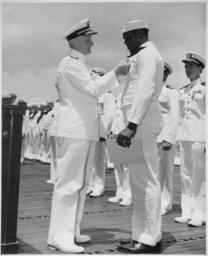 | Keywords: "Admiral C. W. Nimitz, CinCPac, pins Navy Cross on Doris Miller, at ceremony on board warship in Pearl Harbor, T. H.", 0 - NARA - 535857.jpg Scope and content General notes 535857 Local identifier 208-NP-8PP-2 Office for Emergency Management Office of War Information Domestic Operations Branch News Bureau 06/13/1942 - 09/15/1945 Still Picture Records Section Special Media Archives Services Division NWCS-S National Archives at College Park 8601 Adelphi Road College Park MD 20740-6001 1942-05-27 Record group Record Group 208 Records of the Office of War Information 1926 - 1951 Record group ARC 535 Negro Activities in Industry Government and the Armed Forces compiled 1941 - 1945 Series ARC 535799 File unit File unit ARC Variant control numbers NAIL Control Number NWDNS-208-NP-8PP-2<br /> Select List Identifier AFRO/AM LIST 234 Other versions <gallery> File Admiral_C _W _Nimitz _CinCPac _pins_Navy_Cross_on_Doris_Miller _at_ceremony_on_board_warship_in_Pearl_Harbor _T _H _0_-_NARA_-_535857 tif tif File Admiral_C _W _Nimitz _CinCPac _pins_Navy_Cross_on_Doris_Miller _at_ceremony_on_board_warship_in_Pearl_Harbor _T _H _0_-_NARA_-_535857 jpg jpg </gallery> NARA-cooperation PD-USGov Admiral Nimitz pins Navy Cross on Doris Miller Chester Nimitz |