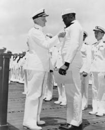 | Keywords: Admiral Chester W. Nimitz pins the Navy Cross on Doris Miller, Pearl Harbor, May 27, 1942.jpg ;Title Admiral Chester W Nimitz USN Commander-in-Chief Pacific Fleet pins the Navy Cross on Doris Miller Steward's Mate 1/c USN at a ceremony on board a U S Navy warship in Pearl Harbor T H May 27 1942 ;Date Created/Published 1942 May 27 ;Medium 1 photographic print ;Part of NAACP photographs of African Americans in the Navy ;Reproduction Number LC-USZ62-131712 b w film copy neg ;Rights Advisory Rights status not evaluated For general information see Copyright and Other Restrictions http //lcweb loc gov/rr/print/195_copr html ;Call Number LOT 13111 no 17 P P ;Repository Library of Congress Prints and Photographs Division Washington D C 20540 USA ;Notes Images available on microfilm including finding aid ; Library of Congress Photoduplication Service File No W-MA-4-11436 Official U S Navy photograph Office of Public Relations Review Section Forms part of NAACP photographs of African Americans in the Navy in Visual materials from the National Association for the Advancement of Colored People records Library of Congress ;Subjects Miller Doris --1919-1944--Military Service Nimitz Chester W -- Chester William --1885-1966--Military Service African Americans--Military Service--1940-1950 Navy Cross Medal --1940-1950 Medals--1940-1950 Uniforms--1940-1950 ;Format Group portraits--1940-1950 Photographic prints--1940-1950 Portrait photographs--1940-1950 Sailors--Hawaii--Pearl Harbor--1940-1950 ;Collections http //www loc gov/pictures/collection/cph/ Miscellaneous Items in High Demand ;Bookmark http //www loc gov/pictures/item/2002716942/ LOC-image cph 3c31712 PD-USGov-Military-Navy Admiral Nimitz pins Navy Cross on Doris Miller Chester Nimitz |